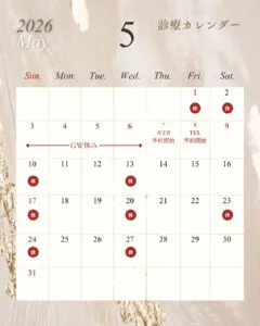 news 2026.04.25 5月診療カレンダー5月診療カレンダーです。5/23(土)は臨時休診です。6月分のWEB予約は5/7(木)からです。WEBページの準備が整い次第、受付開始となります。電話予約は5/8(金)からです。(対応時間11:00~16:00)できる限りweb予約のご利用をよろしくお願いいたします。 のりこ大腸・胃内視鏡消化器内科クリニックfacebookLinetwittergoogle